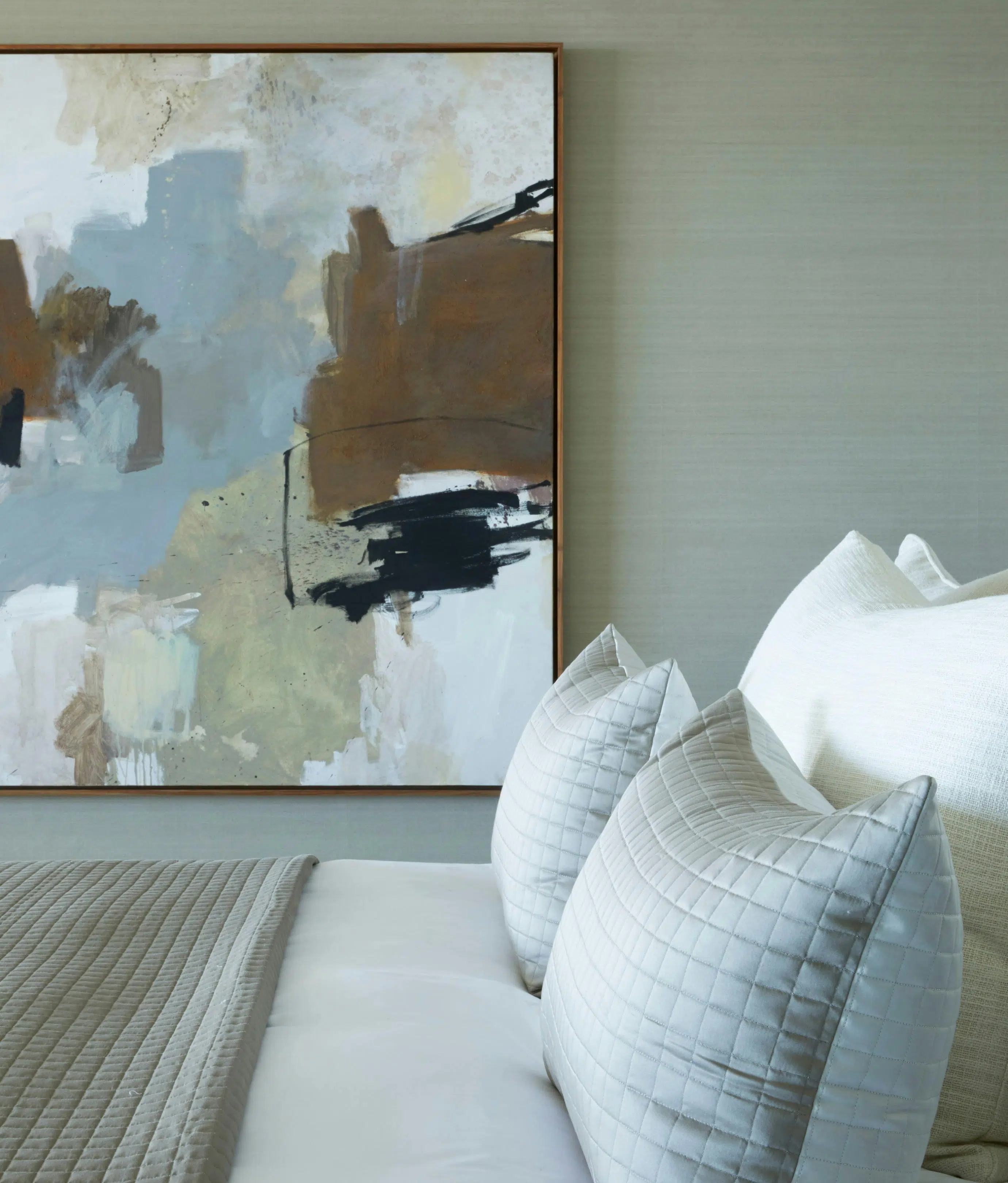 Natural textured wallpaper wrapped the walls, infusing the space with warmth and a comforting atmosphere.